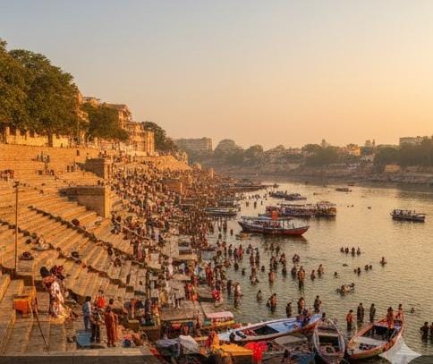 Sacred bathing ghats along the banks of the Sarayu River.
